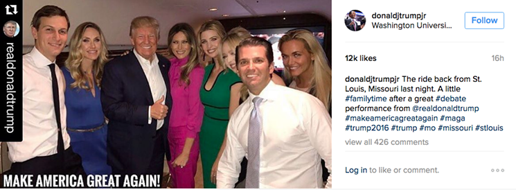 A screen capture from a 2016 post in which Donald Trump Jr. poses with his father and other members of the family.