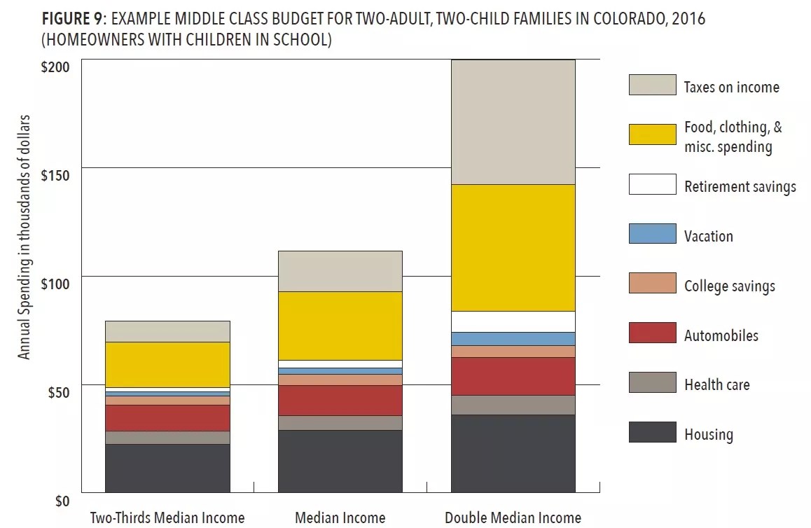 For the study, Ely says, “we had to come up with what a middle-class budget would look like in Colorado for families in different parts of the income range. We tried to be conservative and base our numbers on what was reported by individuals in Colorado through some federal survey sources: the need for housing, food, transportation, taxes, retirement savings, college savings. And when we tallied these amounts up and compared them to where those families fall on the income level in Colorado, you could see it would be very difficult to fully embrace all of those kinds of aspirational budget items given the salaries.”
