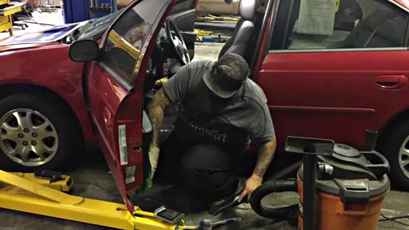 A staffer at Best Auto of Longmont works on a Cars for Christmas ride.