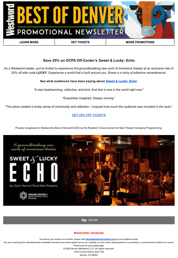 Stay informed about our Best of Denver® winners with promotional offers and announcements from past and present title-holders. Delivered as needed Monday through Friday.