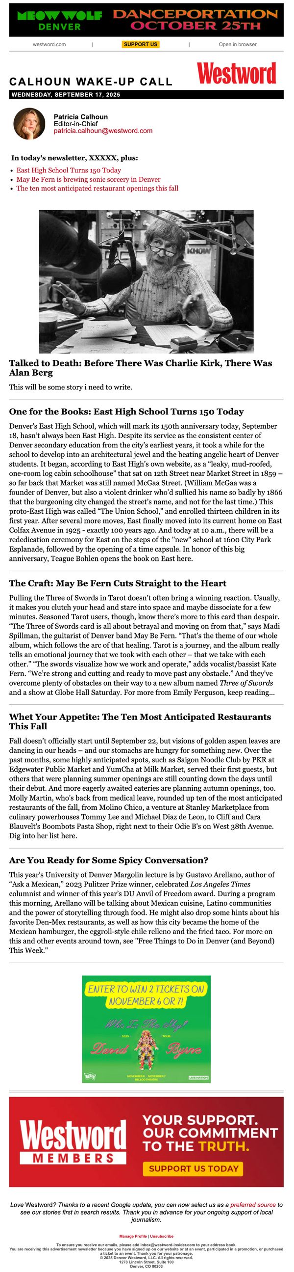 Westword Editor-in-Chief Patricia Calhoun serves up a mix of breaking news and fascinating facts behind the headlines. Delivered every morning Monday through Friday.