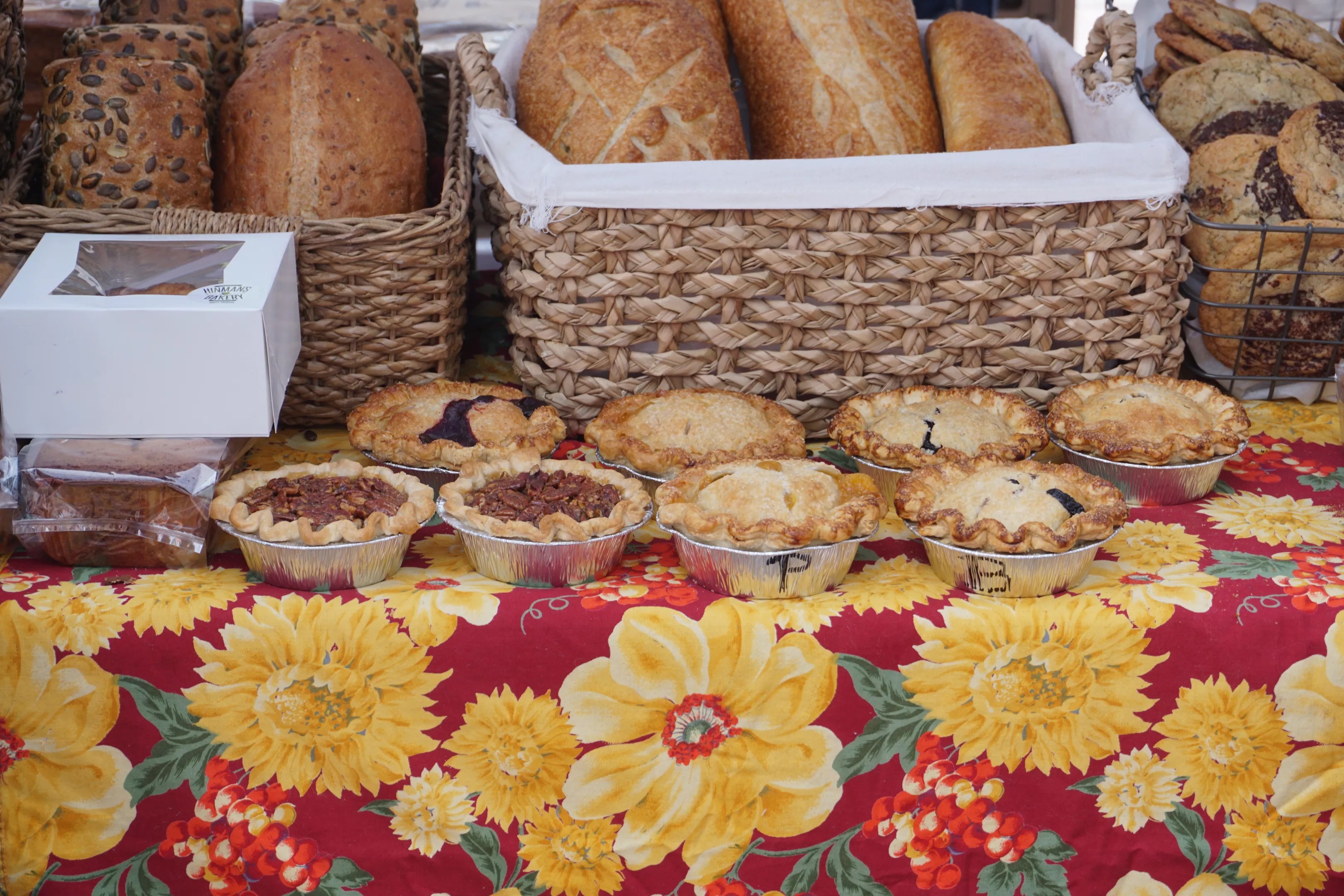 Hinman’s peach pie (center) on display with an array of berry and pecan pies at the Union Station Farmers’ Market.