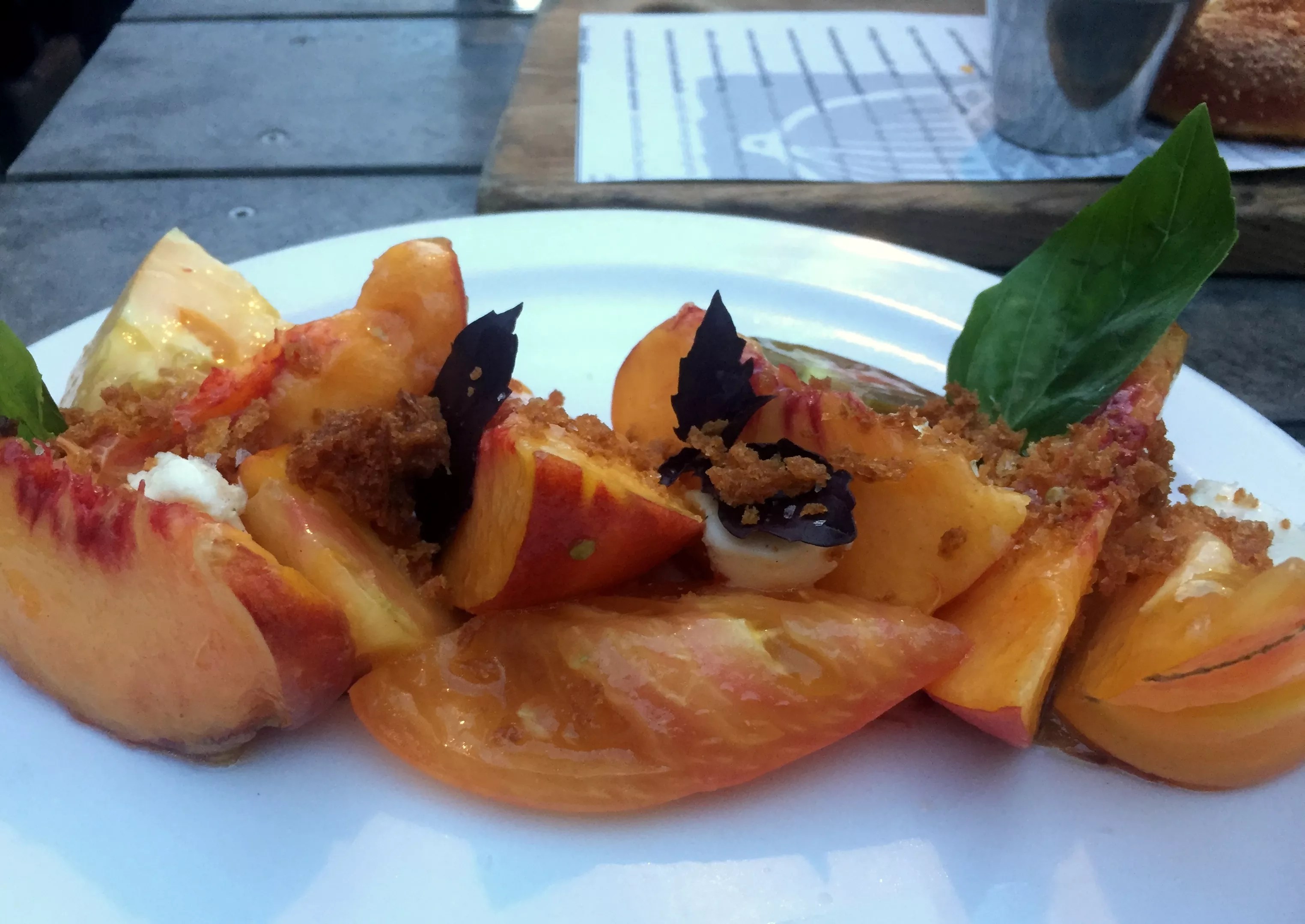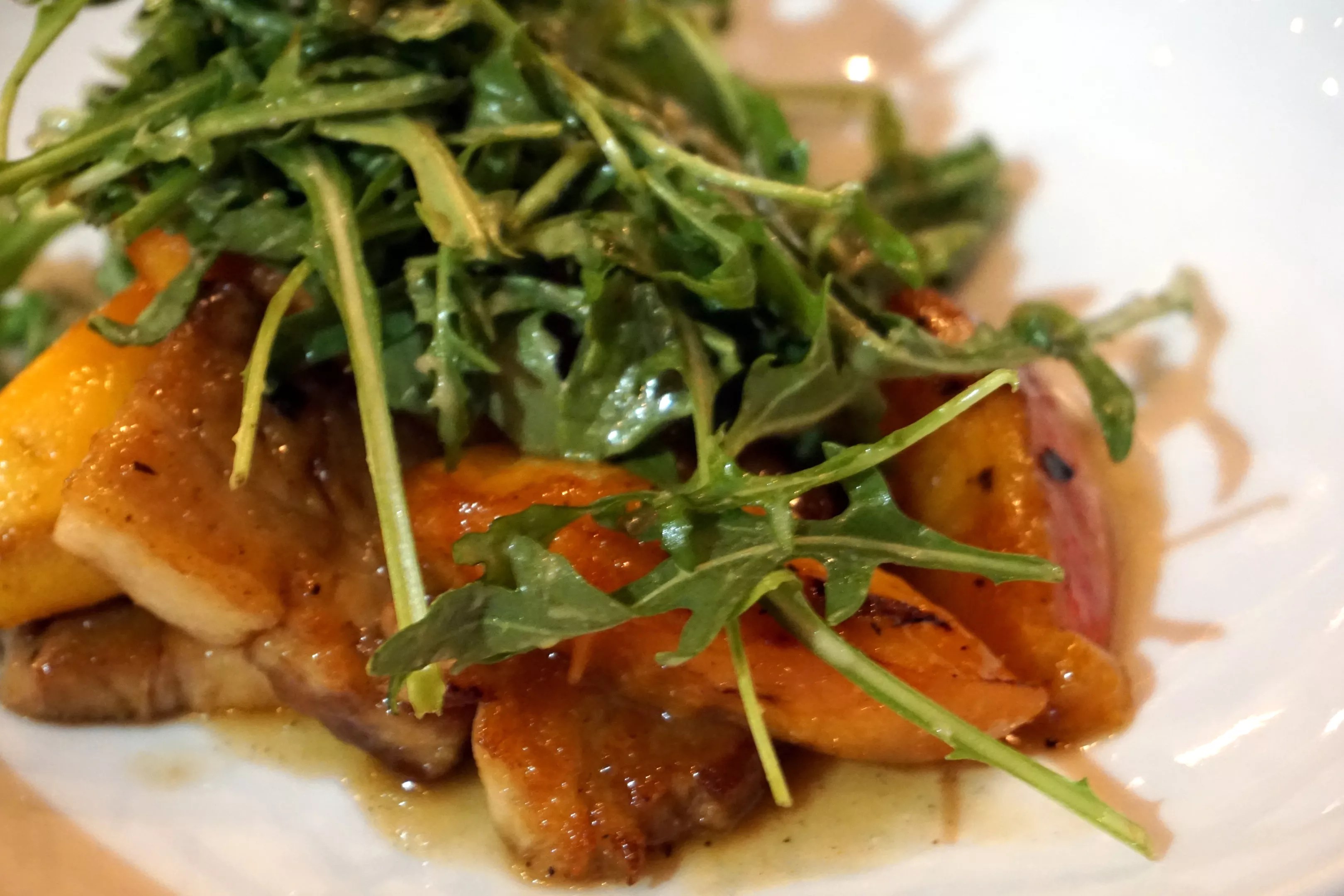 Brazen’s seasonal salad incorporates peaches, pork belly, and arugula.