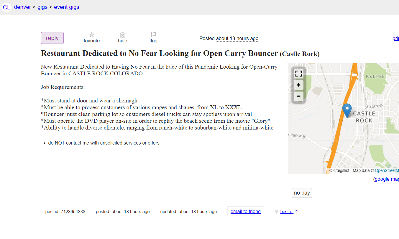 A new Castle Rock restaurant is looking for an open-carry bouncer to man the door of its establishment “dedicated to having no fear in the face of this pandemic,” according to a Craiglist ad posted on May 13.
