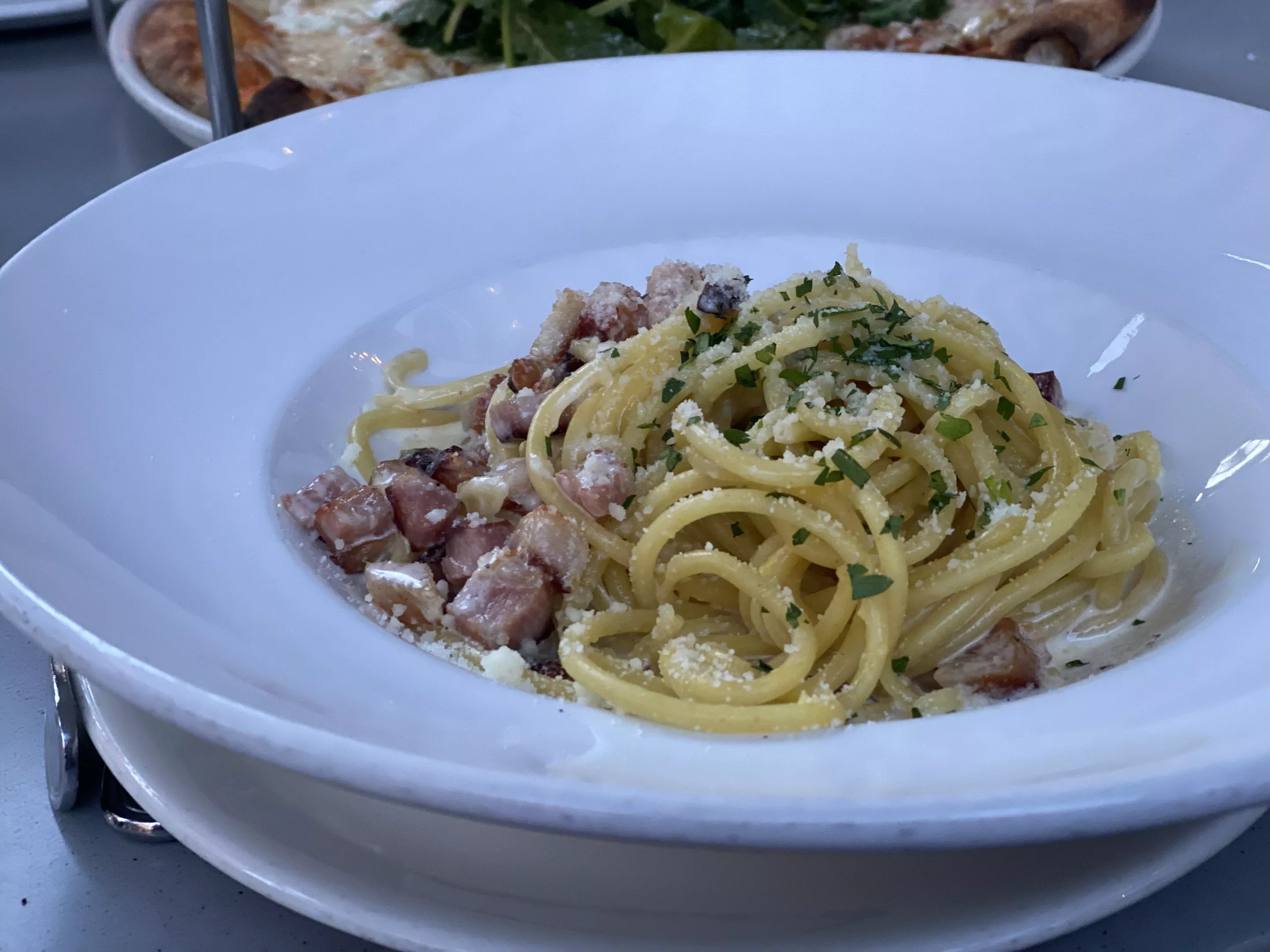 After the pizza, my bucatini carbonara arrived nested and hot, its creaminess in danger of seizing up as the cold night air blew across it. My companion found his noodles too soft and lacking salt; I disagreed, finding the long hollow strands perfectly al dente bits of chewiness. While the dish didn’t quite rival my favorite bucatini-based pasta dish (that would be Roscioli’s amatriciana in Rome) the thick chunks of guanciale made happy hour feel like truly indulgent fare.