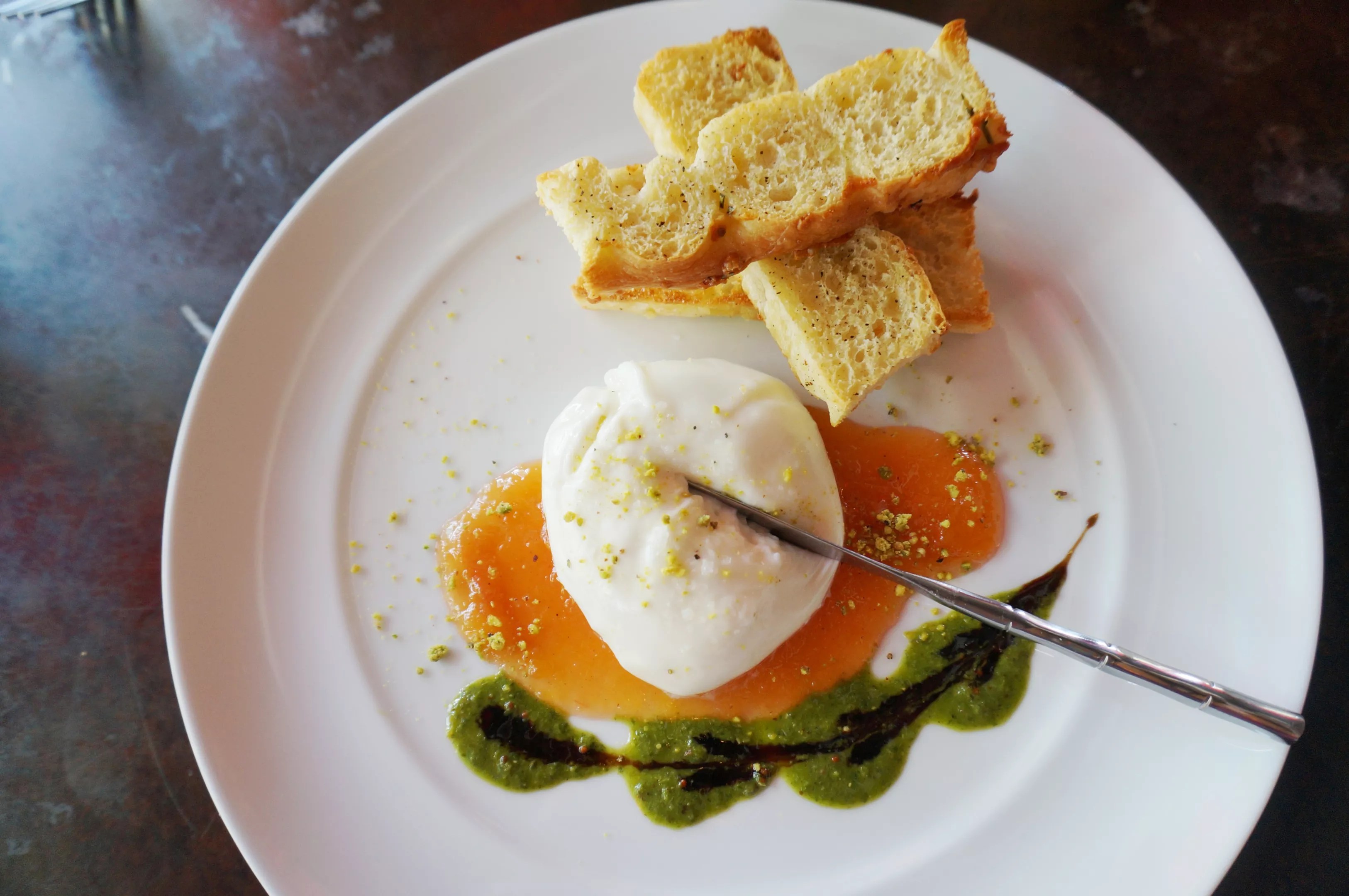 Di Stephano burrata with peach jam, basil emulsion and pistachio dust.