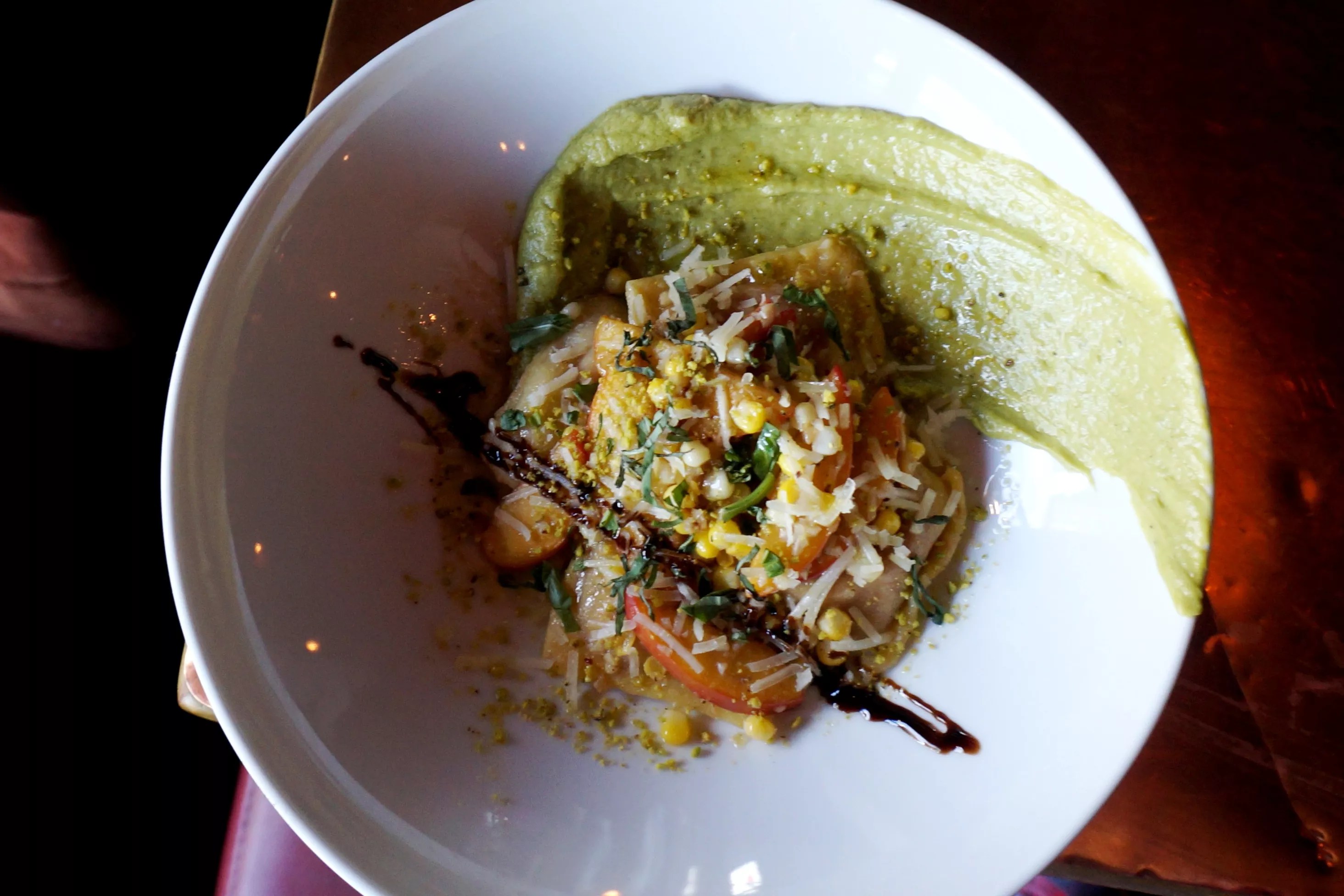 Burrata-beet ravioli with corn, avocado and balsamic-marinated peaches.