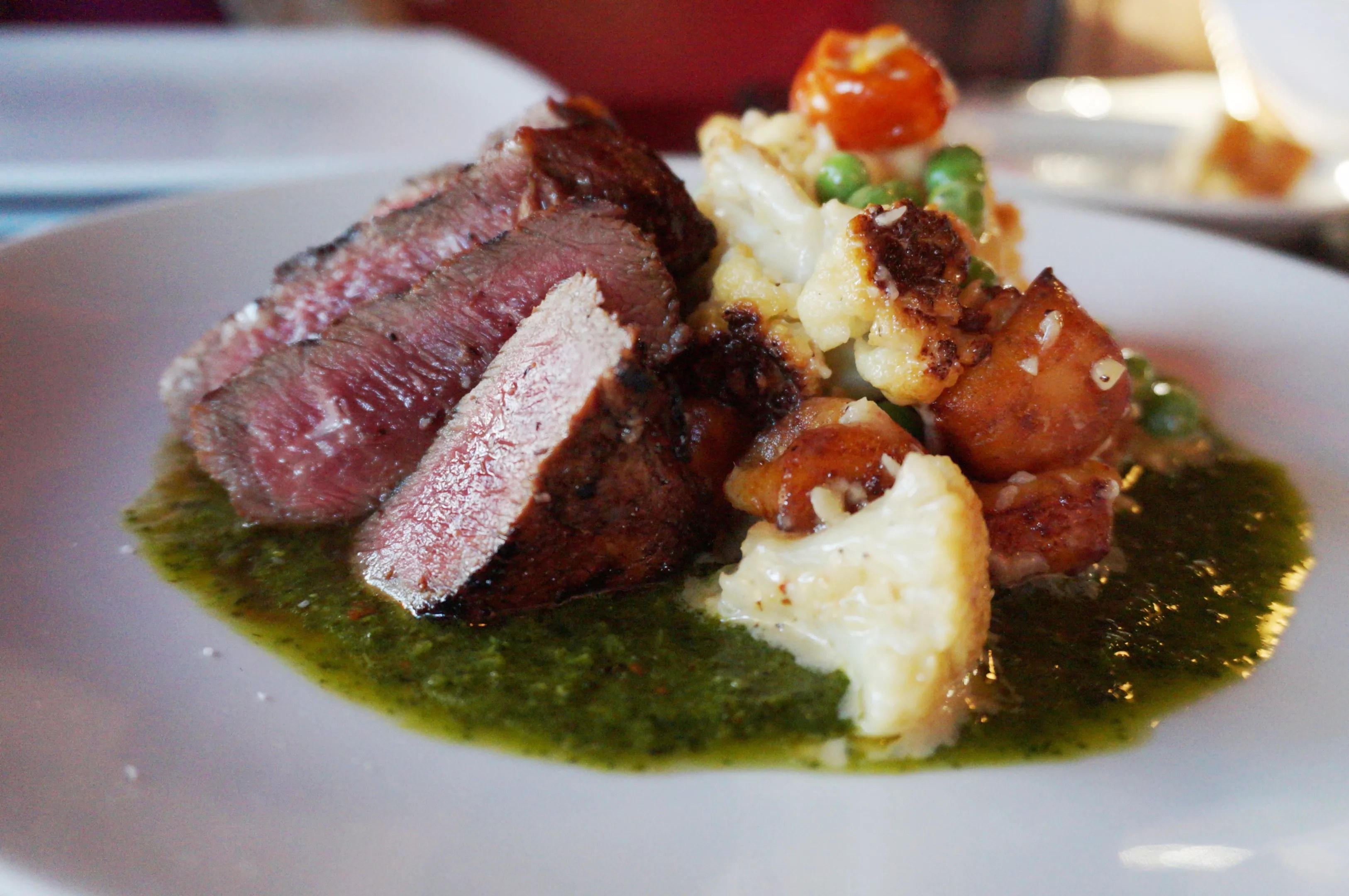 Steak with cauliflower, Roman gnocchi, peas and sauce ravigote.