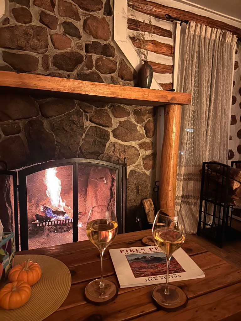 Two glasses of white wine and a wood-burning fire inside the Blue Spruce Cabin.
